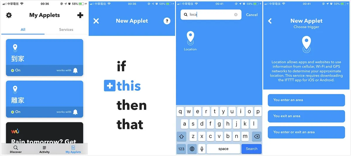 打开IFTTT、登入帐号后,切换到「My Applets」Tab,点右上角「+」新增-> 点击「+this」-> 搜寻「Location」-> 选择是进入还是离开