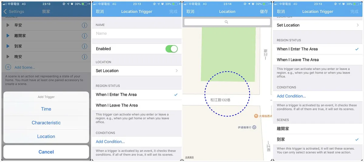 Trigger 类型选「Location」-> Name 输入名字(EX:回家) -> 点「Set Location」设定位置区域 -> 再来 REGION STATUS 可以设定是进入还是离开该区域 -> 最后 SCENES 可以选择对应要执行的「情景」(上面建立的)