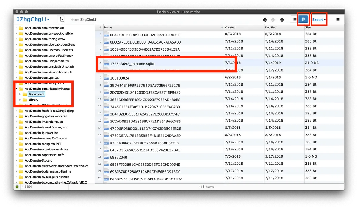 左侧会显示你所有安装的APP,找到米家的APP「AppDomain-com.xiaomi.mihome」->「Documents」