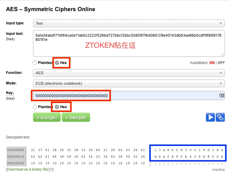 1.将刚刚复制出来的 ZTOKEN贴在「Input Text」,选「Hex」 2.Key输入「00000000000000000000000000000000」32个0,ㄧ样选「Hex」 3.然后按下「Decrypt!」转换 4.全选复制右下角蓝匡&去掉空格后就是我们要的结果 Token