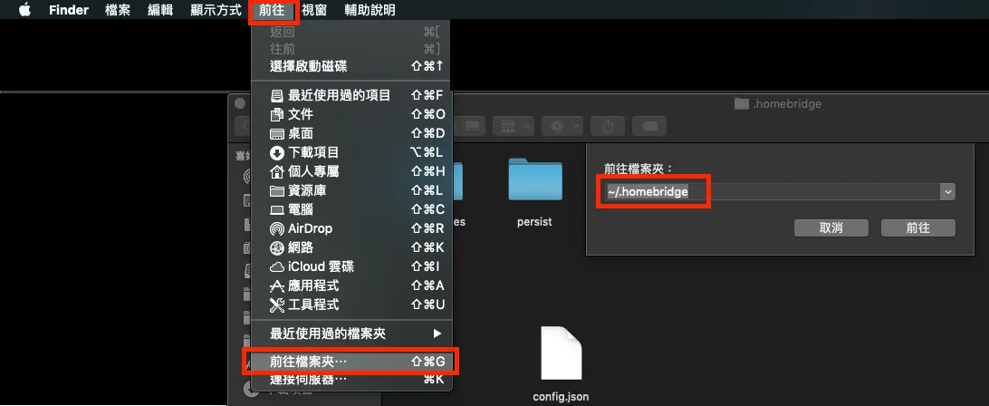使用「Finder」->「前往」->「前往档案夹」-> 输入「~/.homebridge」前往