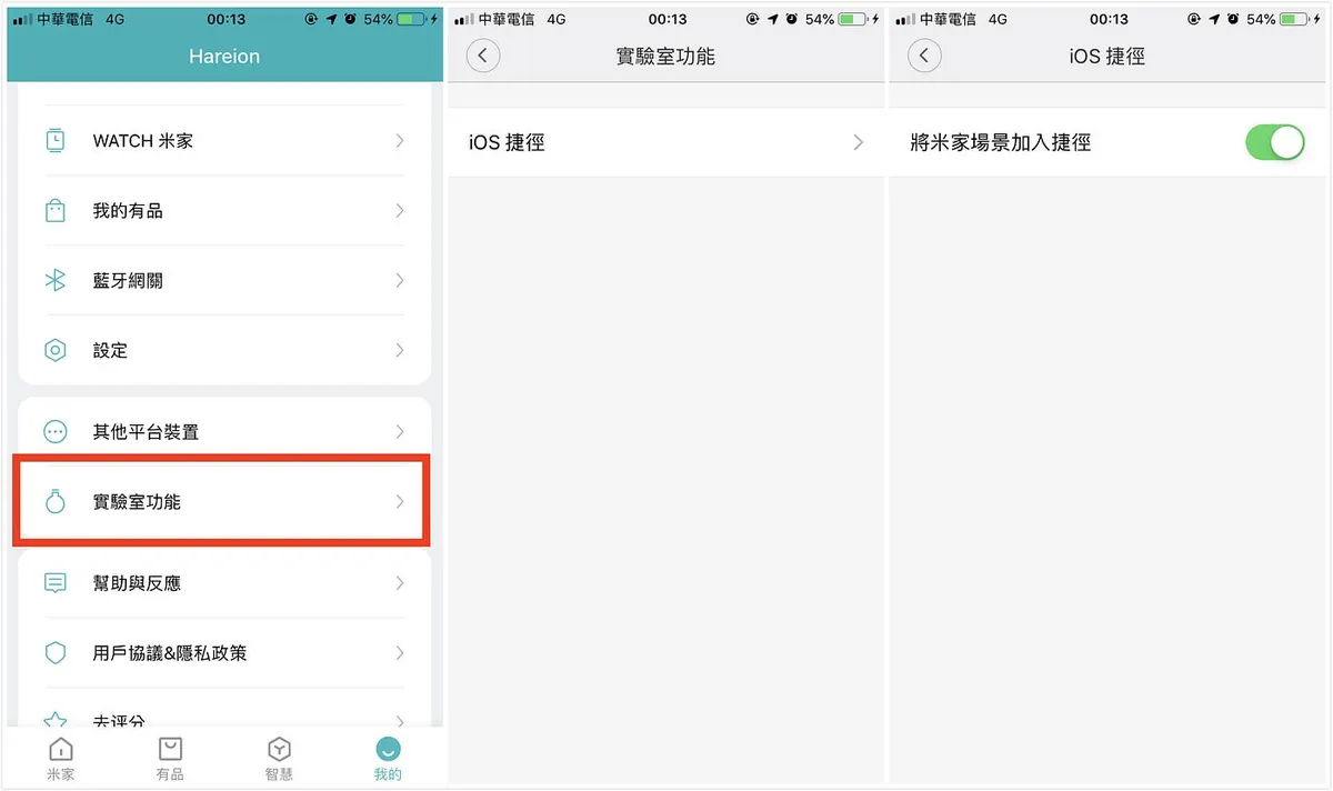 首先到「我的」-> 「实验室功能」->「iOS 捷径」-> 「将米家场景加入捷劲」