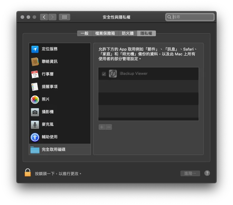 打开「iBackupViewer」,初次启动会要你去 Mac「系统偏好设定」- 「安全性与隐私权」-「隐私权」-「+」- 加入「iBackupViewer」 **如有隐私顾虑可关闭网路使用这套软体、并在使用后移除*