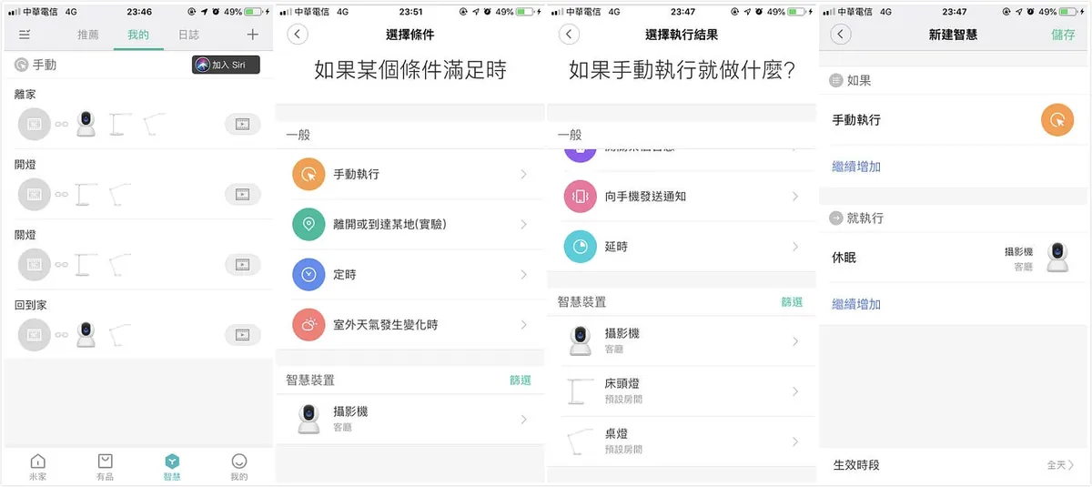 同「家庭设定方式」-> 切换到「智慧」Tab -> 选择「手动执行」-> 下方选择装置操作(由于是原生所以可选更多功能) -> 继续增加其他装置(台灯) -> 「储存」完成!
