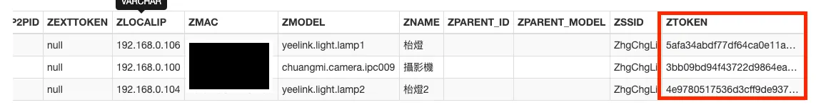 可以看到所有米家APP上的装置资讯栏位,向右滚动到尾端,找到 ZTOKEN 栏位,双击编辑全选复制