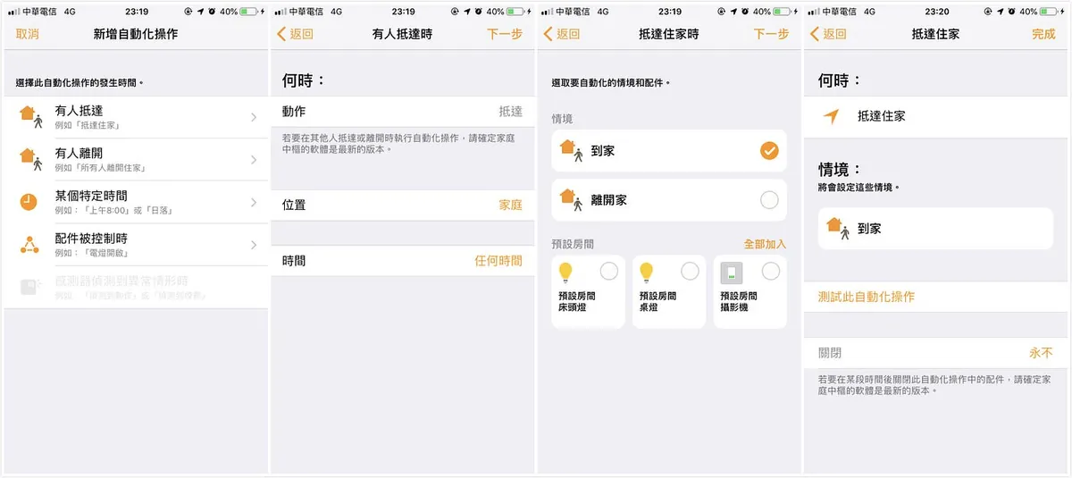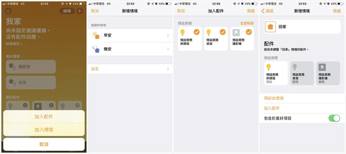 右上角点击「+」-> 加入情境 -> 自订 -> 配件名称自行输入(EX:回家) -> 点下方「加入配件」-> 选择已串接好的HomeKit配件 -> 设定这个场景时的配件状态(摄影机:关/台灯:开) -> 可点「测试情境」进行测试 -> 右上角「完成」!