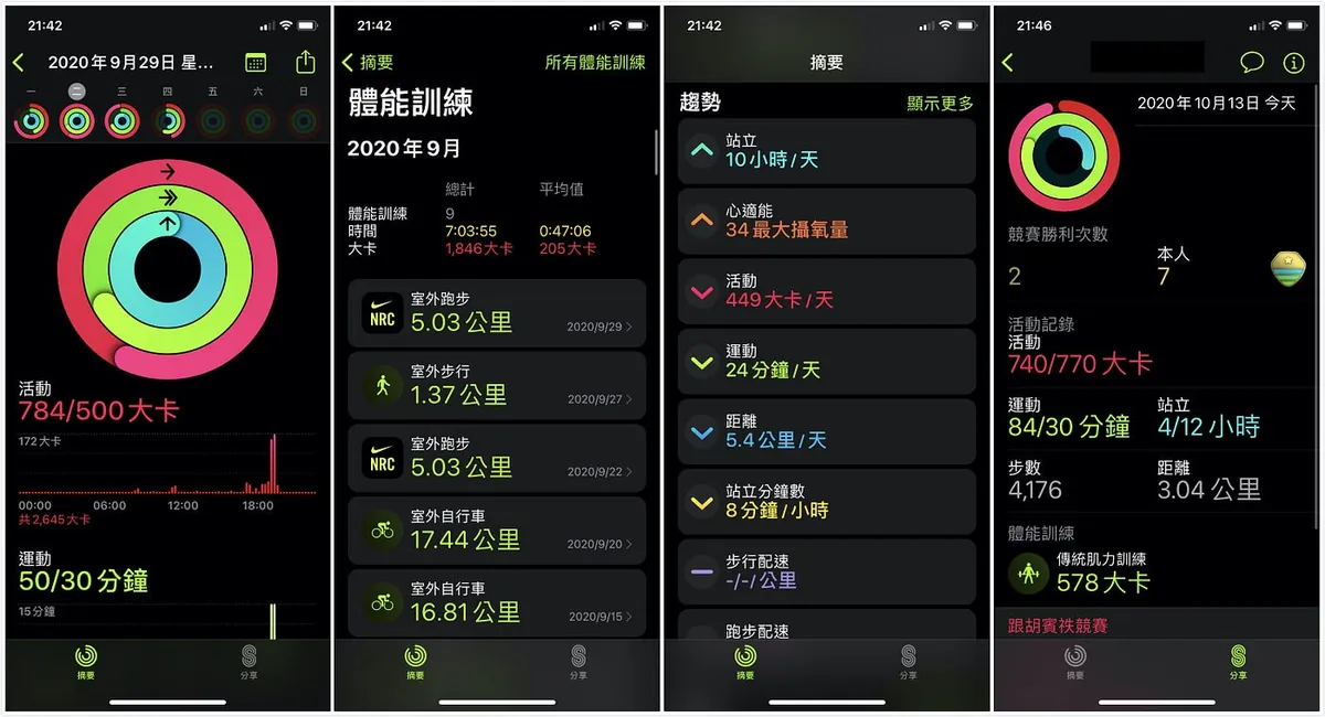 透过有 Apple Watch 才能使用的独占的「健身」APP,能记录你一天的生活,包含每天活动量、走路、心跳、运动纪录,活动量增减统计、更仔细的健康资讯;社群方面还能与朋友竞赛活动量、解锁勋章,增加运动动力。