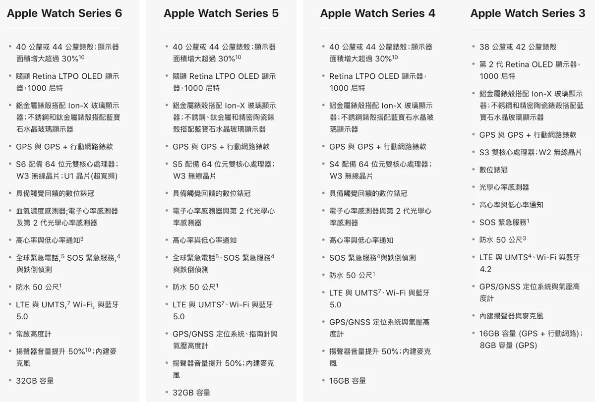 详细比较可参考官网「 比较所有表款 」,还有些细节功能的差异,例如:高度计、指南针…等等