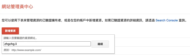 1. 前往 http://google.com/webmasters/verification 2. 点击「 新增资源 」输入「 您的网域」 点击 「继续」