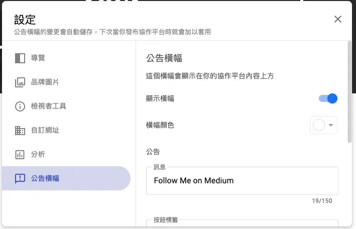 点击右上角「 齿轮(设定) 」选择「 公告横幅 」即可设定,设定完别忘了回到页面按「 发布 」才会生效喔!