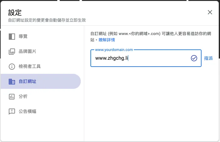 点击右上角「 齿轮(设定) 」选择「 自订网址 」输入想要指派的网域名称,或你想用的子网域,按「 指派 。