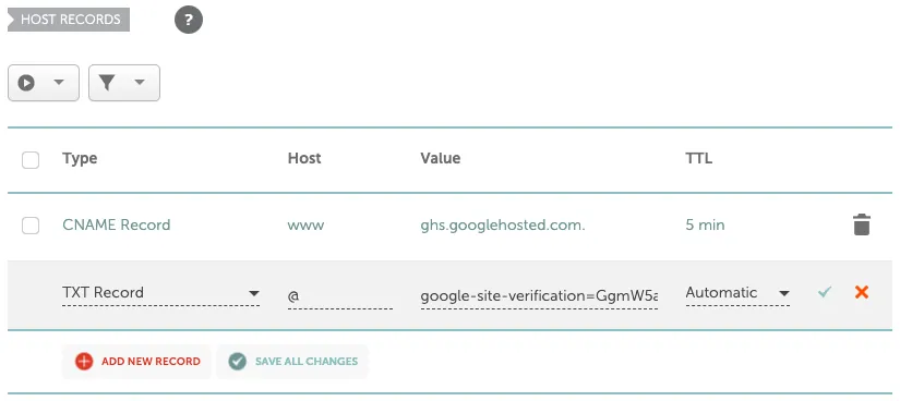 再新增一笔纪录,类型选「 CNAME Record 」、主机输入「 www (或你想用的子网域) 」、值输入「 ghs.googlehosted.com. 」按新增送出。