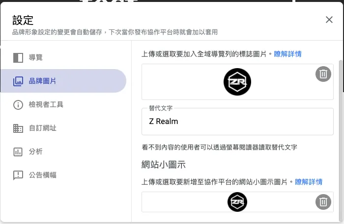 点击右上角「 齿轮(设定) 」选择「 品牌图片 」即可设定,设定完别忘了回到页面按「 发布 」才会生效喔!