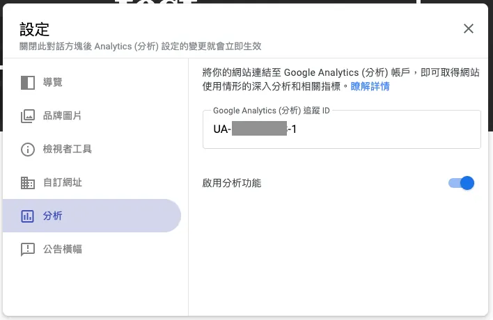 点击右上角「 齿轮(设定) 」选择「 分析 」输入「 GA 追踪 ID 」即可设定,设定完别忘了回到页面按「 发布 」才会生效喔!