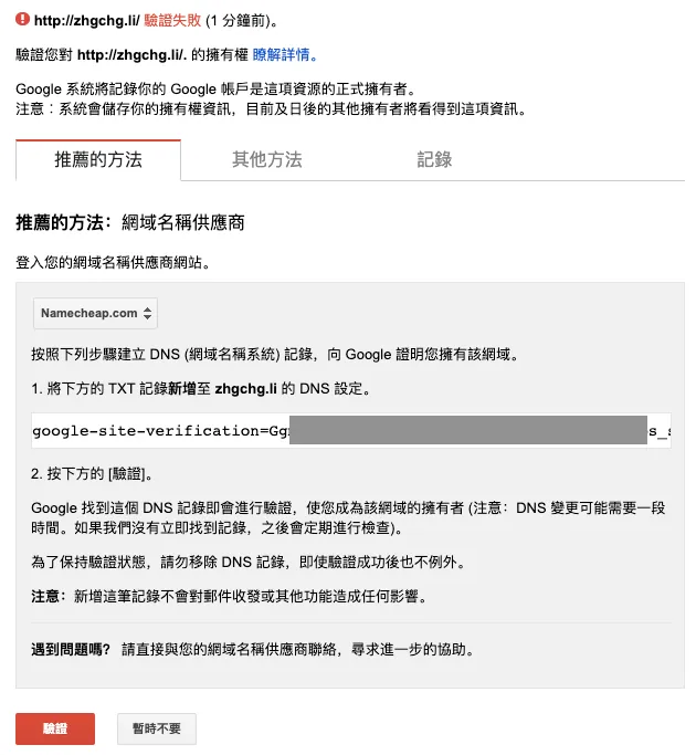 若出现 「验证资源失败」 别急!请再稍等一下,如果超过 1 小时都还是无法,再回头检查一下设定是否有误。