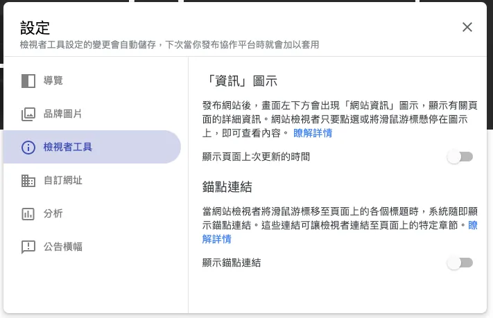 点击右上角「 齿轮(设定) 」选择「 检视者工具 」即可设定,设定完别忘了回到页面按「 发布 」才会生效喔!