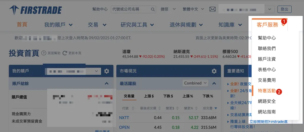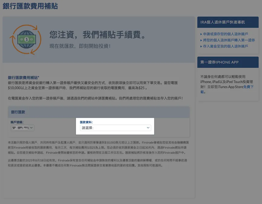 登入 Firstrade 后选择「客户服务」 → 「特惠活动」→ 「汇费补贴」。