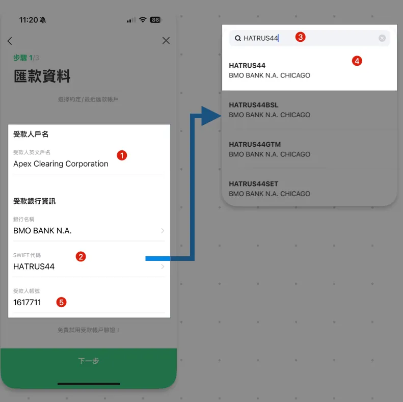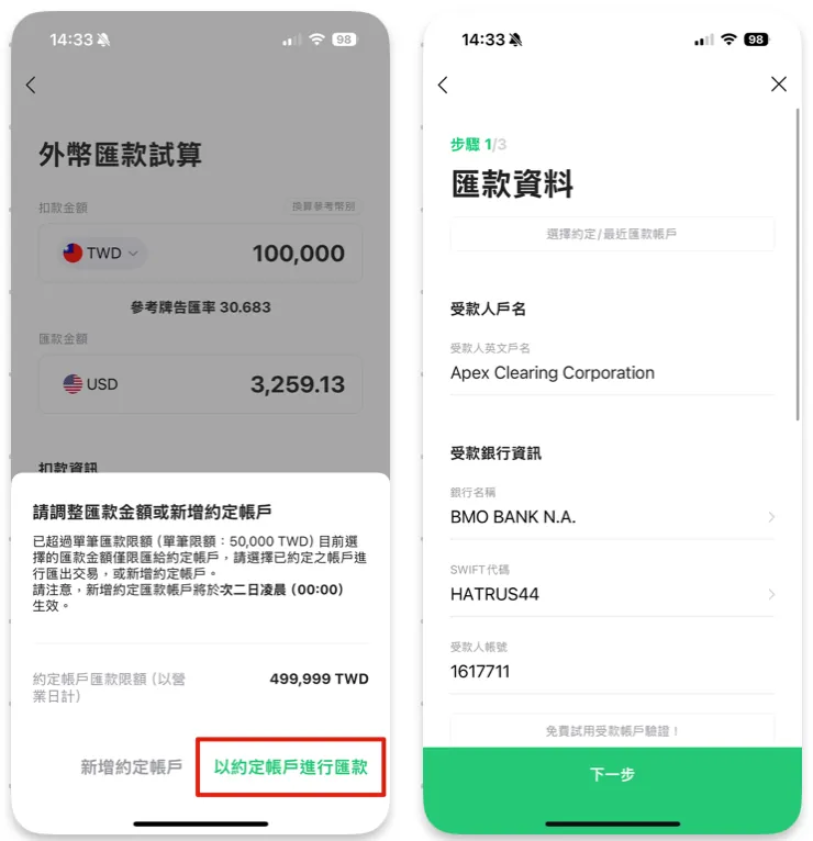 帐户资讯同前文介绍的汇款资讯,依序填入,确认无误后点击「下一步」。