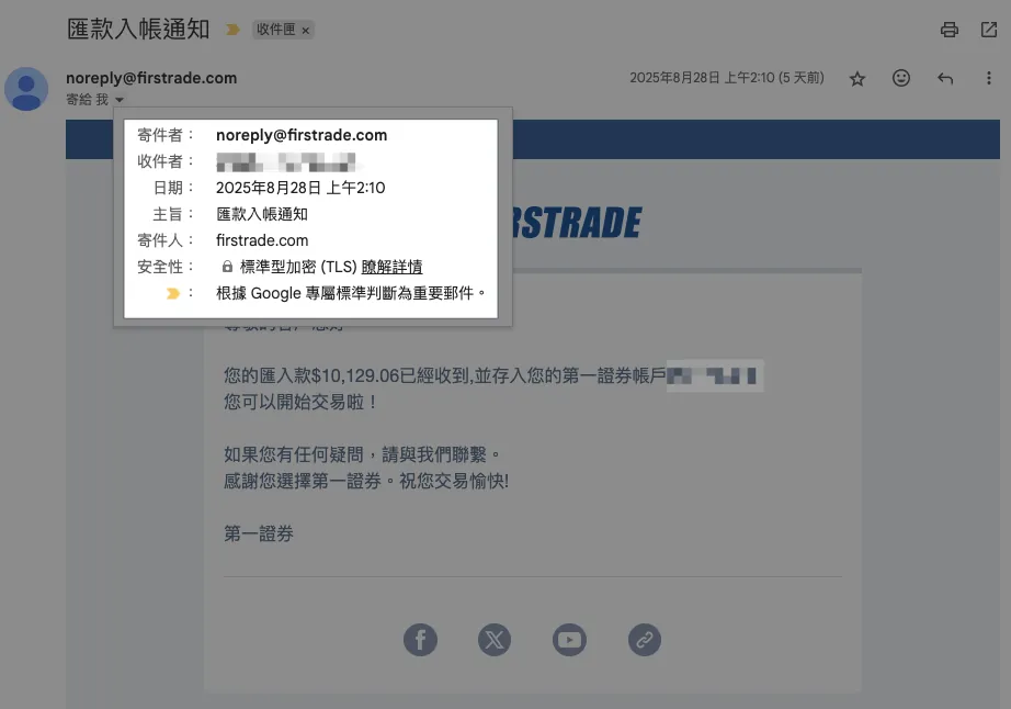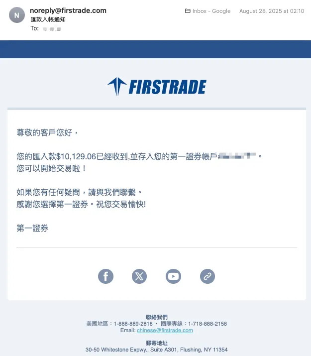 如上图虽然 8/27 AM 09:00 就已收到款项,但是到 8/28 AM 02:10 Firstrade 才确认款项,并收到入帐通知信: