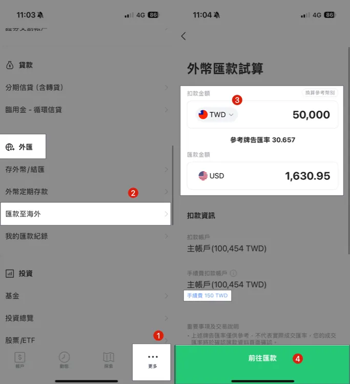 汇款 NTD $50,000 / 手续费 NTD $150 = 0.3%