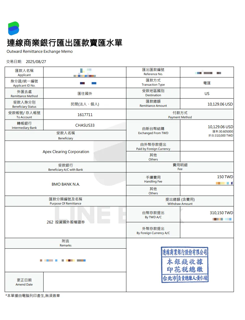 虽然 LINE Bank 只跟我们收 TWD $150,但实际汇费是超过 USD $25,所以还是补贴 USD $25。