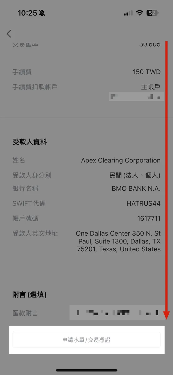 Line Bank App 进度查询通知(如前文),往下滑有一个「申请水单/交易凭证」按钮,点击后就会寄送汇款单到你的 Email,用身分证字号就能开启档案查看。