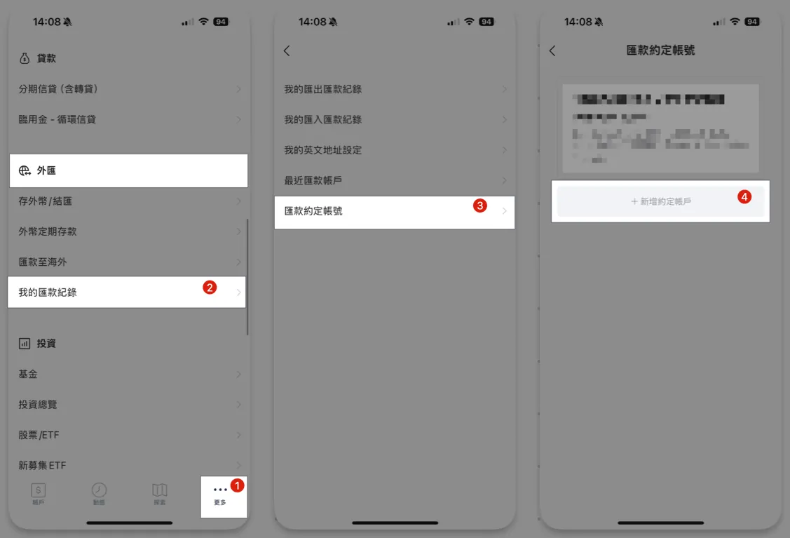 打开 LINE Bank App →「更多」 → 下滑找到外汇,点击「我的汇款纪录」 → 「汇款约定帐号」 → 「新增约定帐号」。