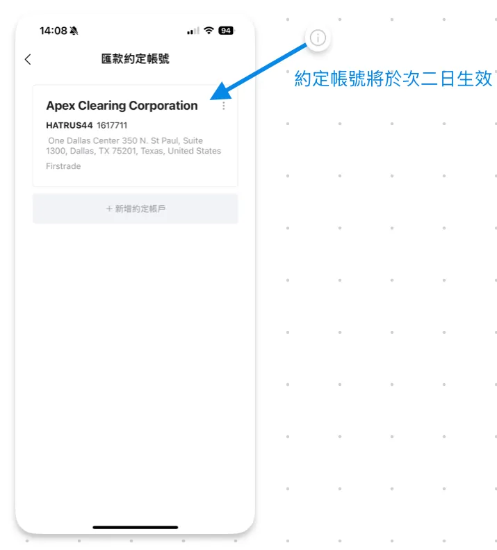 Apex Clearing Corporation受款银行资讯 — 直接填写 SWIFT 代码自动带入