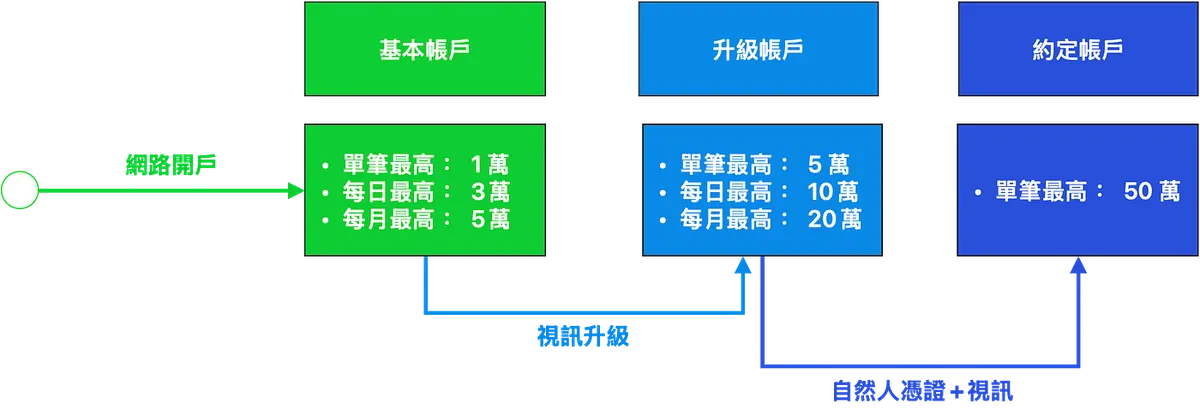 (开户后即享) 基本帐户:单笔最高 1 万、每日最高 3 万、每月最高 5 万。