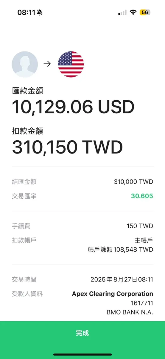 汇款 NTD $300,000 / 手续费 NTD $150 = 0.05%
