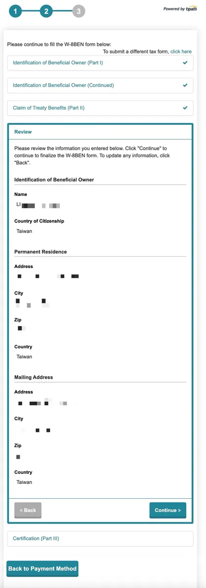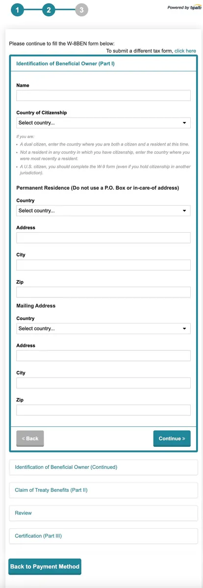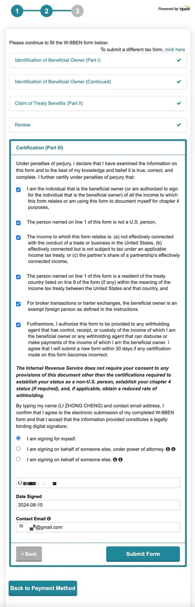 - Select Tax Form:非美过公民无任何美国身份,选择第一个「W-8BEN — for non-US individuals」