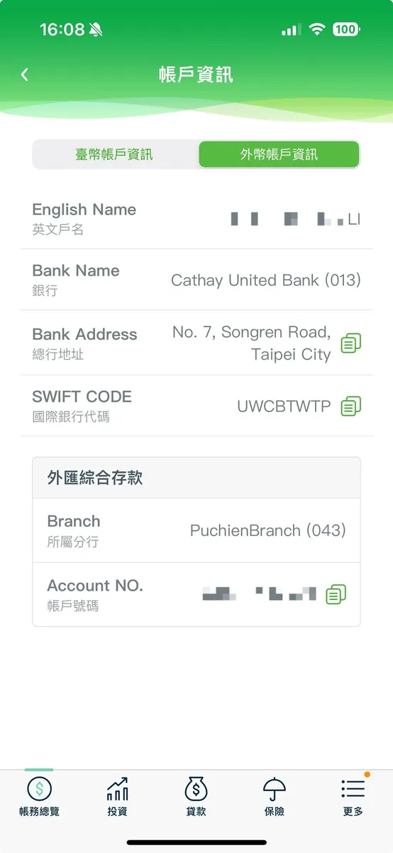 这边我是使用国泰外币帐户,直接进 App 看外币帐户资讯然后填上去。(之后可以去设定改,看起来是要拨款的时候才会验证正确性)