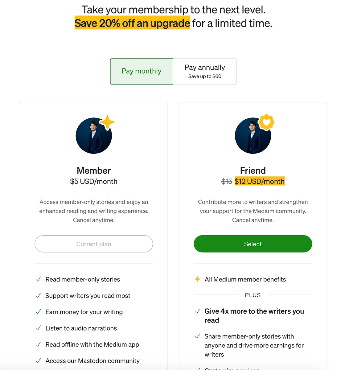 但说来有点好笑,要加入 Medium Partner Program 赚钱之前会需要你先花钱加入 Medium Member 付费会员(每个月最低 $4 美元)。