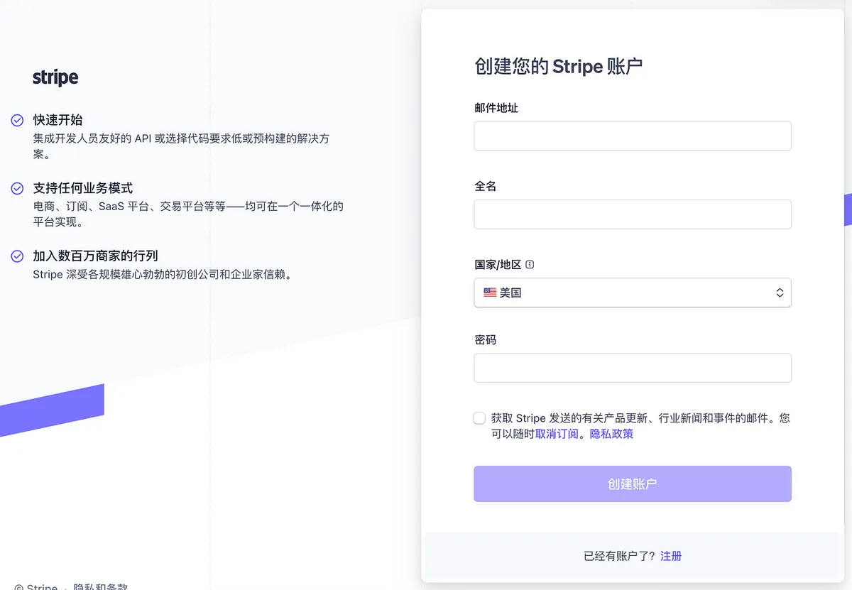 1. 完成 Stripe 帐号注册(开户)