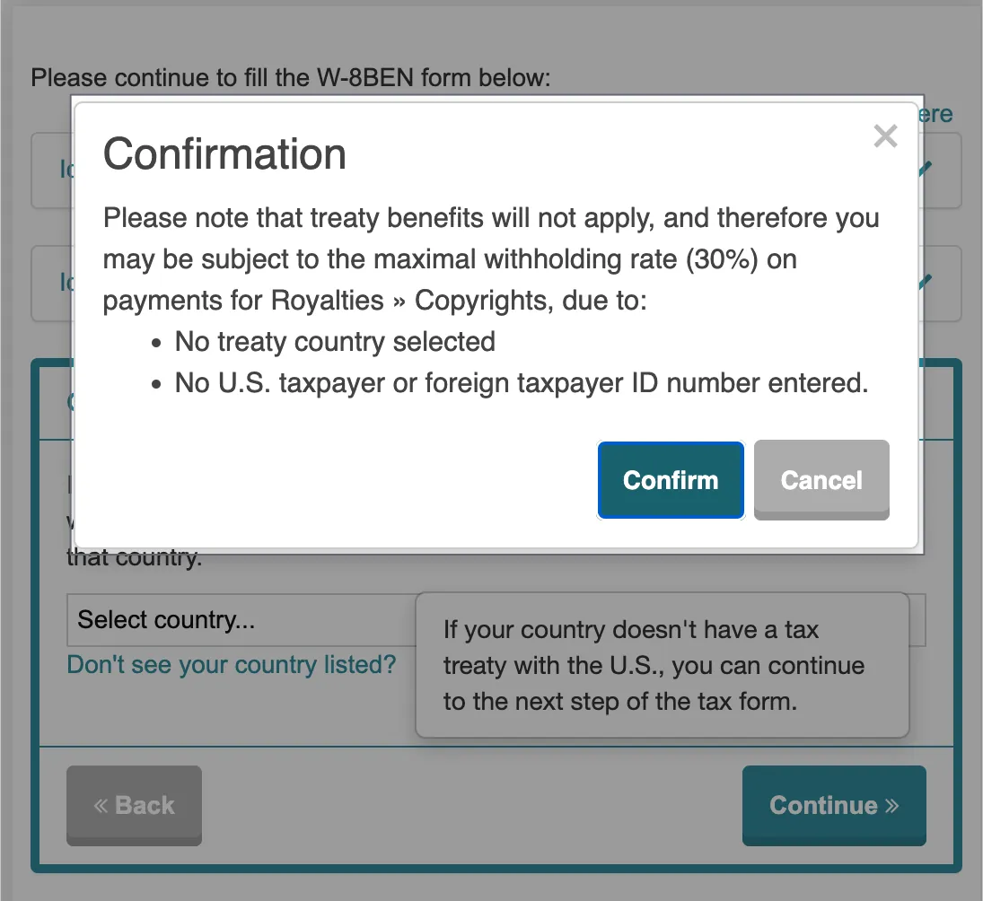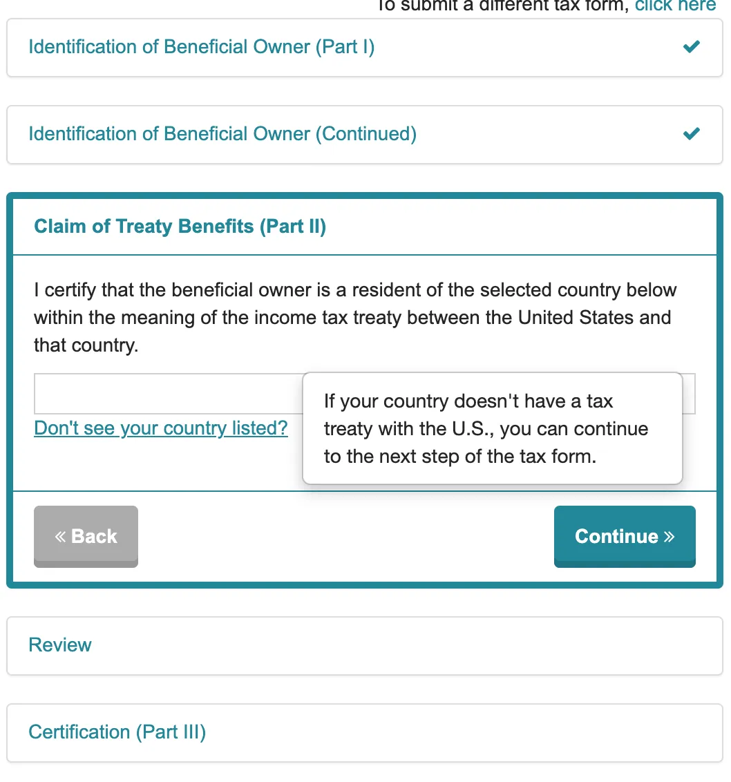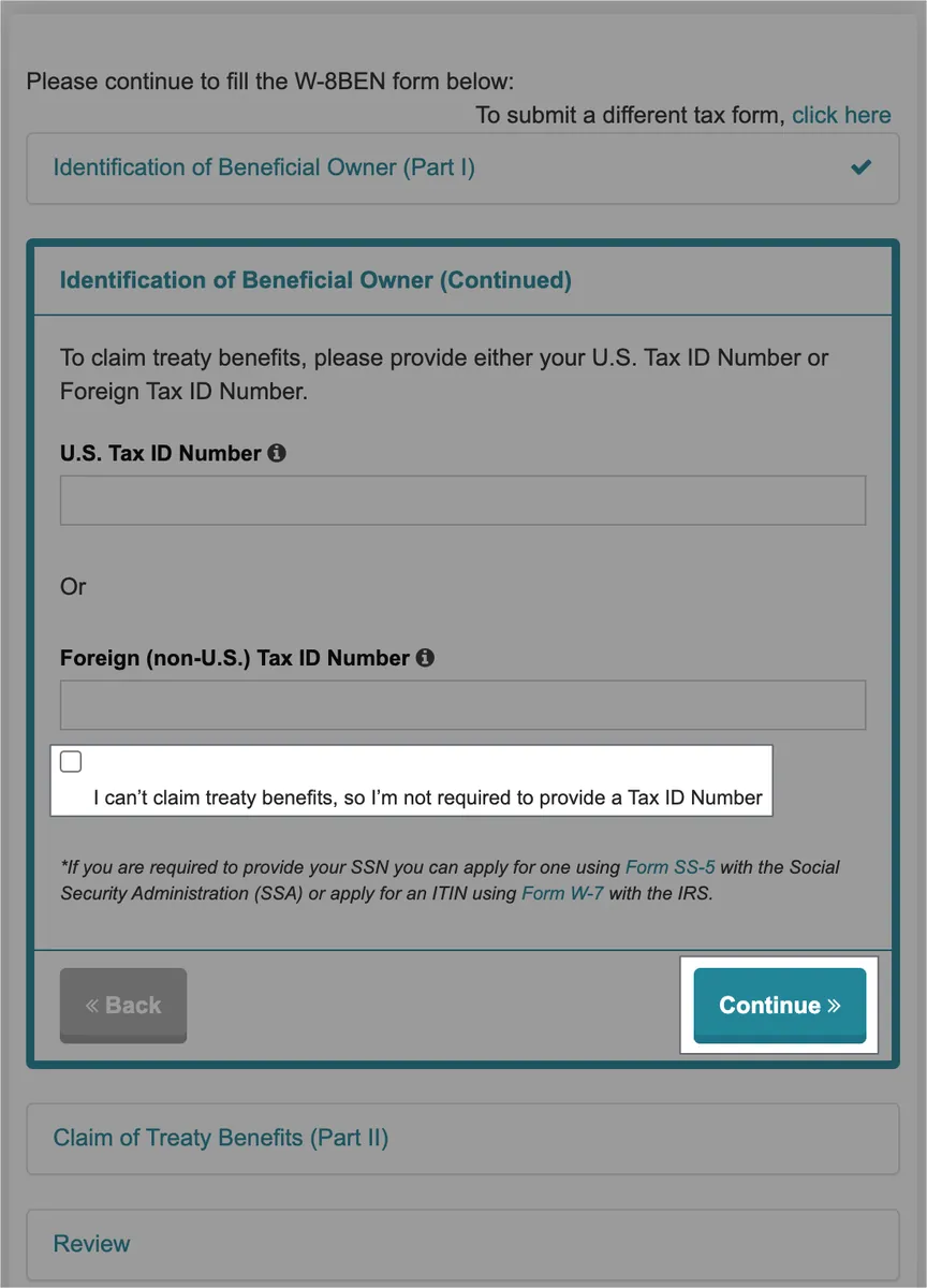 这一步直接勾选「I can’t claim treaty benefits, so I’m not required to provide a Tax ID Number」点击「Continue」