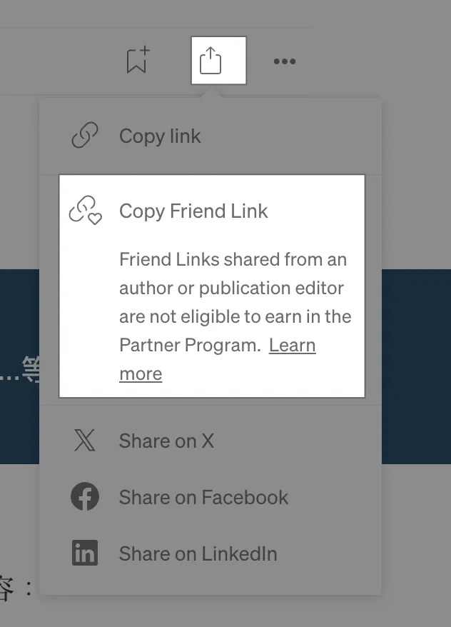 - 如果想给朋友免费查看完整文章可从 Share 选择「Copy Friend Link」从这连结就能免费查看完整文章,但也不会获得收益。