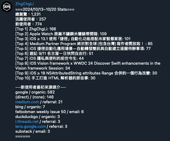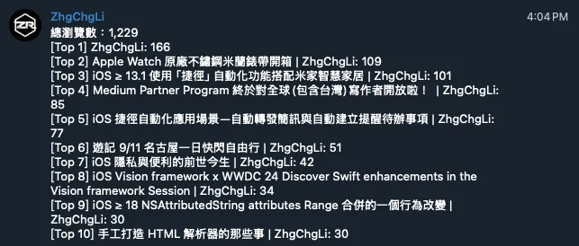 这次要介绍的串接场景是接续上一篇「 10 分钟快速移转 Line Notify 到 Telegram Bot 通知 」时想到我的 Medium 备份站「 zhgchg.li 」一直都没有关注他的 GA4 网站数据,想说好像可以多做一个通知机器人,每日传送过去 7 天的网站数据到指定的 Telegram Channel 让我知道。