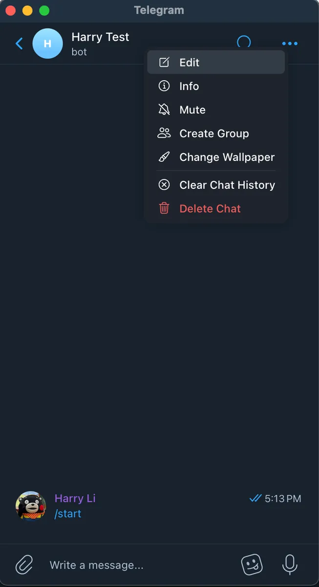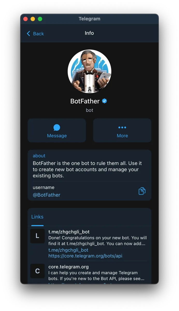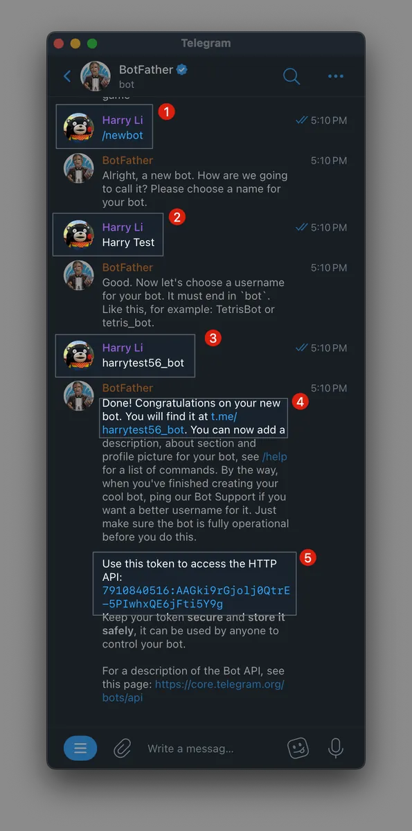 bot为结尾,例如我的zhgchgli_bot)你的 Bot 连结,点进进入开始使用 (e.g. t.me/harrytest56_bot)