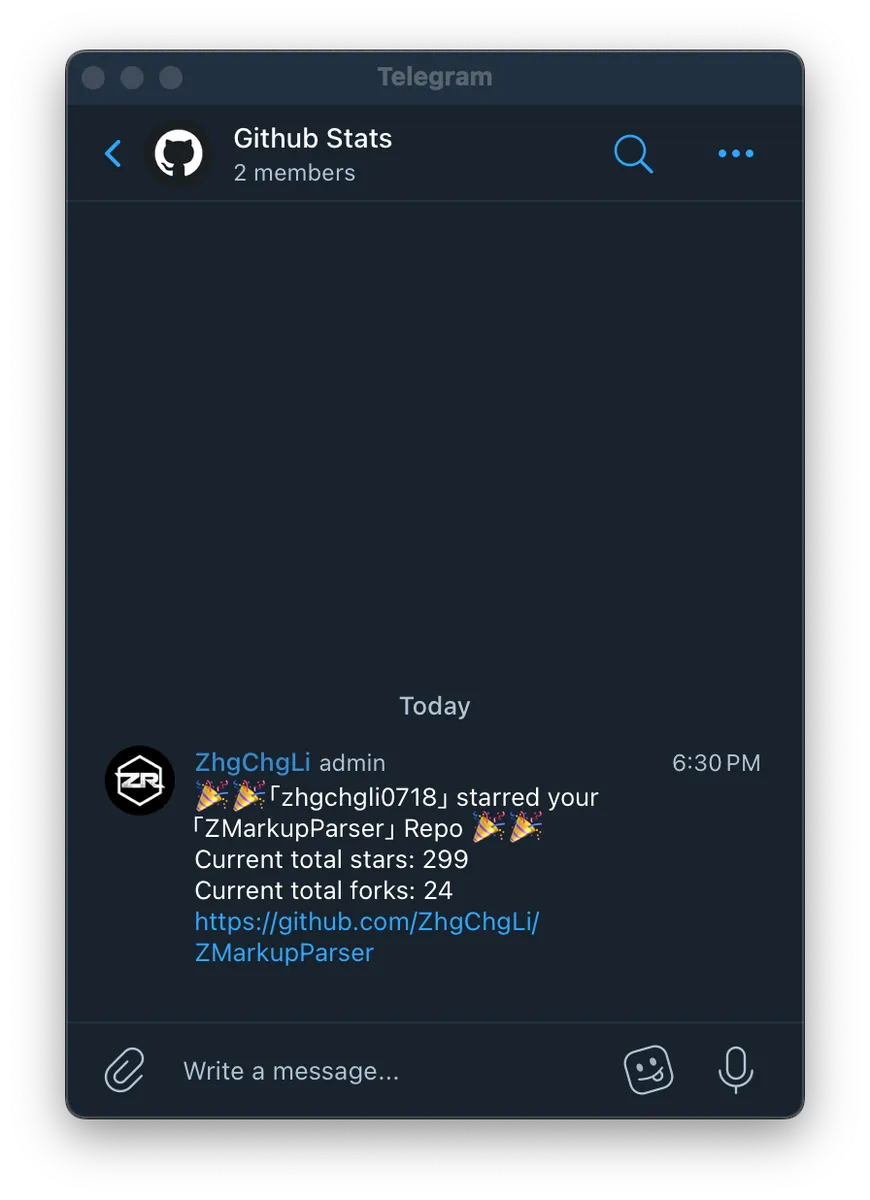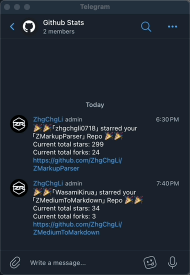 验证成功! 当有人按我的 Repo Star 时能正确改发送通知到 Telegram Group!🎉🎉🎉