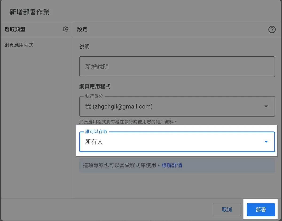 Google Apps Script 网页应用程式部署、更新、使用、除错可参考我之前的文章「 使用 Google Apps Script 实现 Google 服务 RPA 自动化 」。
