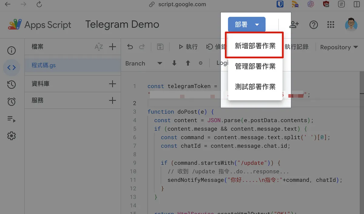 ⚠️⚠️⚠️请注意,如果 Google Apps Script 程式码有变更要点击部署->管理部署->选择建立新版本才会生效,细节可参考上述文章。