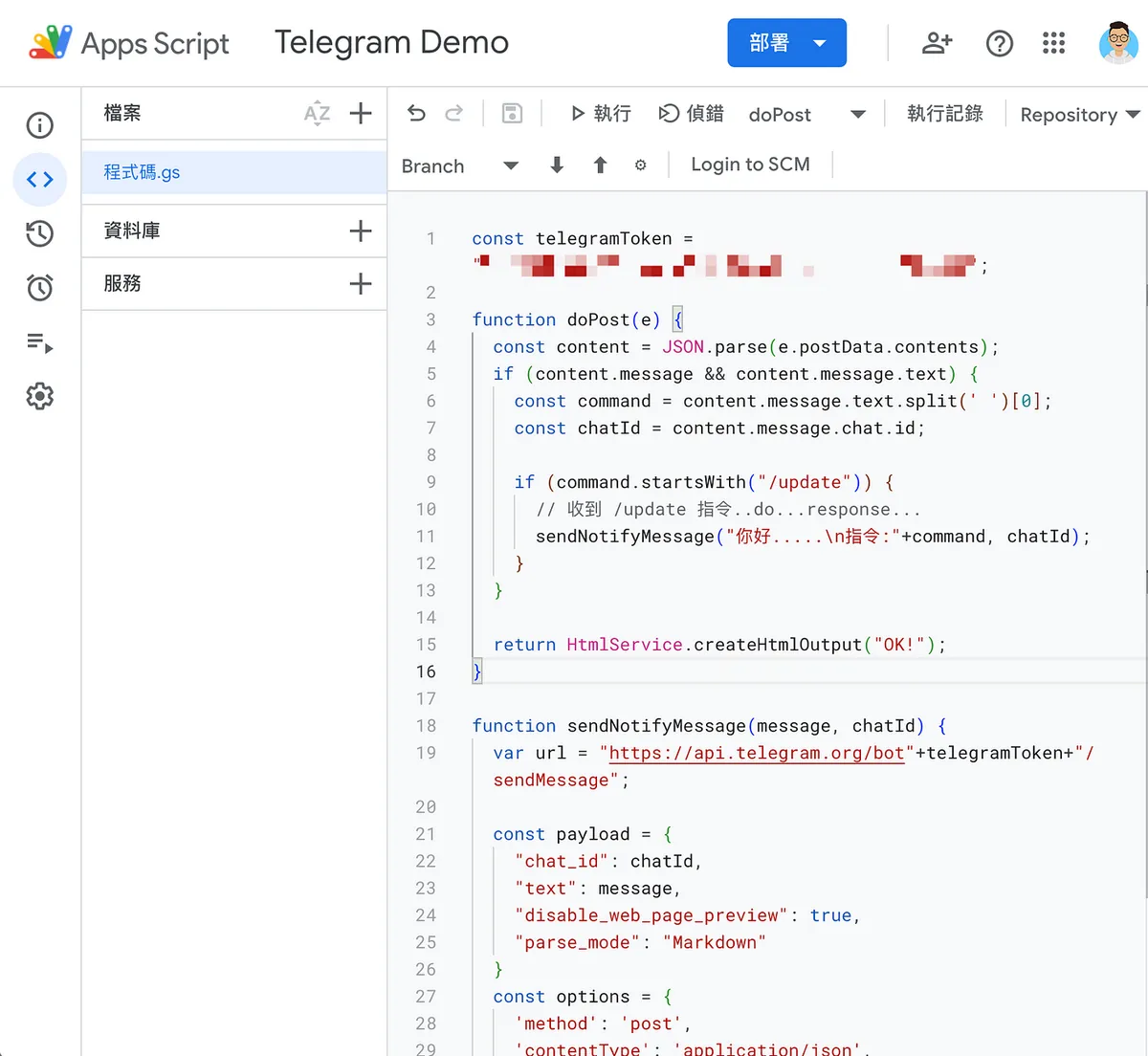 telegramToken=你的_BOT_API_Token上述 Demo 程式我们在收到 Post 请求、Command 参数等于