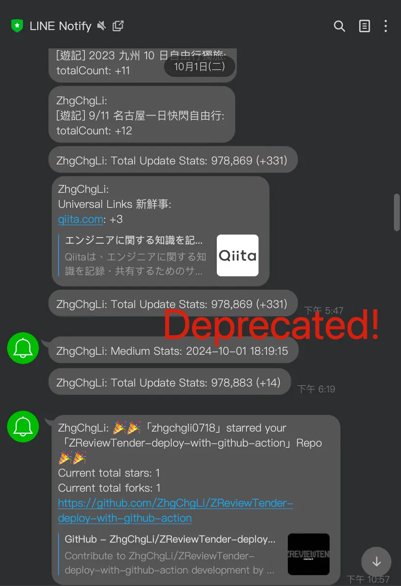 撷取自 Line Notify 官网 , Line 于 2024/10/08 发文公告 Line Notify 将于 2025/04/01 完全关闭,如需继续使用 Line 做为讯息通知,只能用付费的 Message API 。