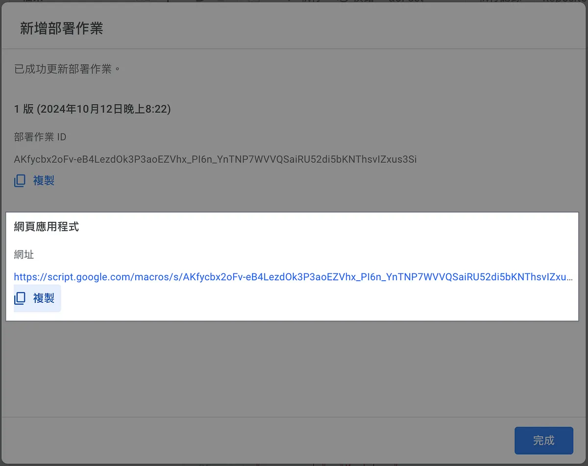 你的 Webhook 网址。 复制下来。 e.g.https://script.google.com/macros/s/AKfycbx2oFv-eB4LezdOk3P3aoEZVhx_PI6n_YnTNP7WVVQSaiRU52di5bKNThsvIZxus3Si/exec